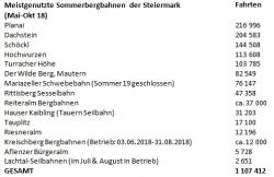 Meistgenutzte Sommerbergbahnen der SteiermarkHoch hinaus: mehr als 1,1 Mio. Fahrten im Sommer. Steiermark Tourismus hat wieder die Zahlen der steirischen Bergbahnen erhoben. Gerade im Sommer haben die Berge ihren Reiz: für die entsprechende Abkühlung bei den aktuellen Hitzetagen/-nächten, als Orte der Ruhe bzw. Ausgangspunkt für Wanderungen oder als Spielplätze mit Ausblick. Auf Platz 1 liegt die Planai, gefolgt vom Dachstein und Schöckl. „Die stetigen Investitionen im alpinen Bereich haben in den letzten Jahren dafür gesorgt, dass das Angebot auf unseren steirischen Bergen weiter attraktiviert werden konnte. Dies ist essenziell, um einerseits im Mitbewerb bestehen zu können andererseits dem Gast Anlass für ganzjährige Besuche zu bieten. Darüber hinaus bringt eine derartige Entwicklung eine Steigerung der Wertschöpfung in die steirischen Regionen und sichert zudem Arbeitsplätze,“ so Tourismuslandesrätin Barbara Eibinger-Miedl. „Die steirischen Berge sind ein absolutes Ganzjahresthema – und das für Einheimische wie auch Urlauber. Mit neuen Attraktionen wie beispielsweise dem Bankerlweg auf der Hochwurzen, den Reiteralm Junior Trails oder den unzähligen Attraktionen am Hauser Kaibling mit Schaferlebnis, E-Trial-Parcours und vielem mehr ist auch für die unterschiedlichen Zielgruppe ein entsprechendes Angebot gegeben,“ so Erich Neuhold, GF Steiermark Tourismus. Erhoben wurden die Zahlen von Mai bis Oktober 2018.