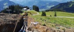 Das Jahr 2020 stand bei den Bergbahnen Brixen im Thale und Scheffau ganz im Zeichen des Ausbaus um fit für die Zukunft zu sein. So wurde im Bereich der Brantlalm auf Brixener Seite ein neuer Speicherteich errichtet, Teich- und Feldleitungen zur Erweiterung des bestehenden Netzes lieferte die Tiroler Rohre GmbH. Dieses Projekt ist ein weiteres Beispiel dafür, dass Qualität, Nachhaltigkeit und regionale Produktion an Stellenwert gewonnen haben. Der Tiroler Traditionsbetrieb lieferte für dieses Vorhaben knapp neun Kilometer Rohrleitungen vom Typ PUR Longlife in verschiedenen Nennweiten von DN 80 bis DN 400. Der Einbau der Feldleitungen erfolgte durch die Firma HV Bau, die Teichleitungen wurden von der Firma Stöckl Bau realisiert. Der geplante Speicherteich Brantlalm mit einem Speichervolumen von gut 155.700 m³ soll zukünftig den Bergbahnen Brixen i.Th. sowie der Bergbahn Scheffau je zur Hälfte zur Verfügung stehen. Als Jahresspeicher soll so die Wasserbereitstellung für die Grundbeschneiung zu Saisonbeginn gesichert werden und für die Ausbesserungsbeschneiung während der Saison genügend Wasser bereithalten. Eine naturnahe Ausgestaltung des Speichers war eine der zentralen Aufgaben an das Planungsbüro Klenkhart und Partner. Zudem soll der Teich auch im Sommer eine Funktion als landschaftsgestaltendes Element besitzen und sich möglichst nahtlos in den Almweidebereich einpassen. Neben den Bergbahnen Scheffau und Brixen im Thale investierten auch die Bergbahnen Hopfgarten und Ellmau, ebenfalls Mitglieder der Skiwelt Wilder Kaiser - Brixental, in die Schneesicherheit ihrer Schigebiete und vertrauen dabei auf die Kompetenzen von TRM. So konnten dort im Jahr 2020 insgesamt gut 16 Kilometer neue Schneileitungen verbaut werden. Alleine beim Projekt der Bergbahnen Brixen im Thale entspricht dies mit neun Kilometern Rohrlänge gut 45 vollen LKW-Ladungen. Dabei genießen die Kunden auf die großen Vorteile, die sie mit dem Partner TRM haben. Die Werksnähe garantiert kurze Lieferwege, das wiederum verkürzt die Lieferzeiten und sollte einmal etwas zusätzlich benötigt werden, lassen sich Formstücke auch selbst vor Ort abholen. Zusätzlich erfolgt durch die hohe Serviceorientierung von TRM ein laufender Abgleich. Zum einen in der Planungsphase, in der das Angebot auf Planbasis erstellt wird, zum anderen auch laufend während des Projektes selbst, denn so lassen sich Retouren oder überschüssige Lieferungen und damit Kosten einschränken. Die sichere Wasserversorgung.