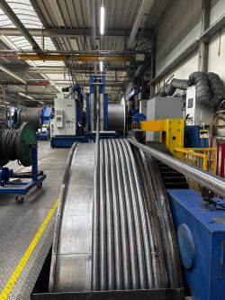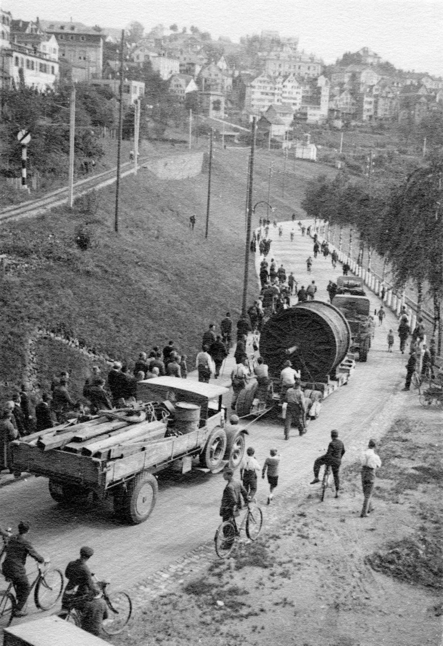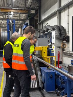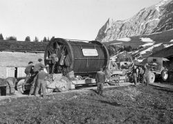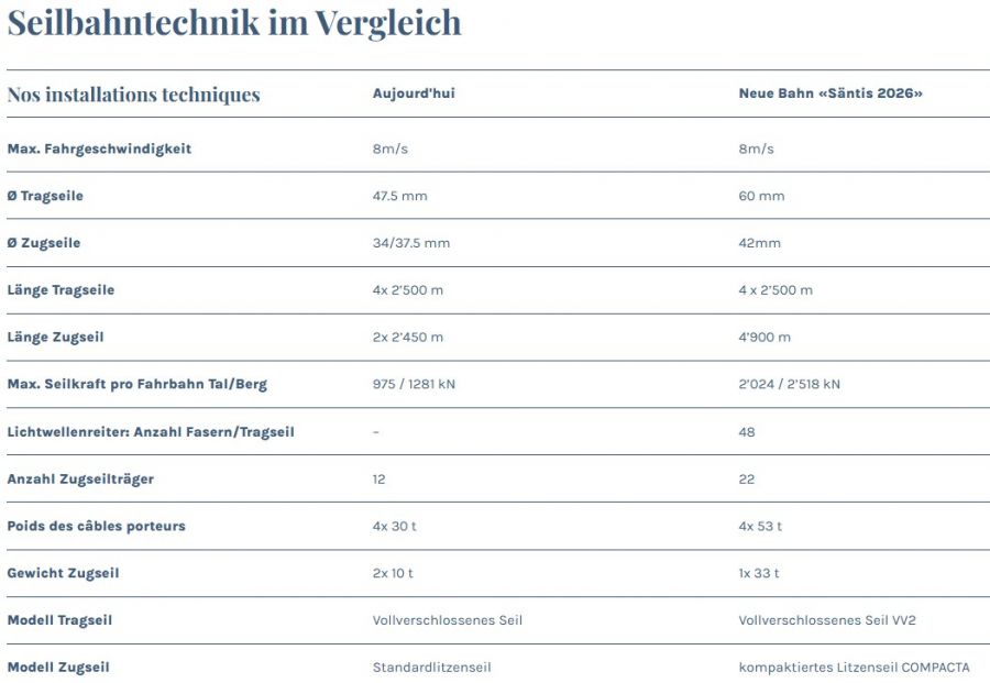 Fatzer: Stahlseilproduktion für «Säntis 2026»Herzstück einer Pendelbahn Im Projekt «Säntis 2026» schreiten die Arbeiten weiter voran. Ziel ist es, im Spätherbst 2026 den Bahnbetrieb mit der neuen Schwebebahn aufzunehmen. Ein zentraler Meilenstein auf diesem Weg ist die Produktion der neuen Trag- und Zugseile für die Säntis-Schwebebahn. Gefertigt werden sie bei der Fatzer AG in Romanshorn, dem Weltmarktführer für Hochleistungsstahlseile. Die Stahlseilproduktion ist bereits abgeschlossen, damit die Seile in den kommenden Bauphasen integriert werden können. Neue Dimensionen des Zugseiles Das neue 4’900 m lange Zugseil ist ein kompaktiertes Litzenseil, wobei die beiden Seilenden mit einem Spleiss zu einer Endlos-Schleife verbunden werden. Die Laufwerke der Kabinen werden zukünftig mit einer Klemme direkt am Zugseil befestigt. Künftig befördert somit ein einziges umlaufendes Stahlseil die Kabinen. Durch die Reduktion von bisher einem Zug- und einem Gegenseil auf eine gespleisste Seilschlaufe entfallen die Endbefestigungen als Verbindungselemente. Damit die Belastung durch die Klemmen nicht dauernd auf die gleichen Stellen am Seil einwirken, müssen die Fahrzeuge periodisch auf dem Zugseil versetzt werden. Tragseile mit integrierten Lichtwellenleiter Die Tragseile übernehmen nicht nur die Aufgabe der Lastaufhängung, sondern ermöglichen durch die Integration von 48 Glasfasern im Kern des Seiles die Datenkommunikation zwischen Berg und Tal. Gesamthaft dauerte die Seilfertigung bei Fatzer AG für die neuen Zug- und Tragseile über 500 Stunden. In der Bergstation werden die Tragseile auf einem Betonpoller fixiert. Da die Seile alle 12 Jahre verschoben werden müssen, ist in diesem Bereich ein Seilhaspel angebracht, welcher die nötige Seilreserve für die ganze Lebensdauer aufnimmt. Die Glasfasern werden über eine Spleissmuffe mit einem handelsüblichen Kabel verbunden und der Gebäudeinstallation zugeführt. Pro Fahrbahn wirken dabei 2’518 kN (ca. 250 t) Seilkraft auf die Gebäudestruktur ein. Diese gegenüber der jetzigen Anlage verdoppelten Zugkräfte werden durch entsprechende Verankerungen vom Gebäude in die Felsstruktur eingeleitet. Nachdem die Seile auf dem Berg befestigt worden sind, werden diese auf die Stütze aufgelegt und im Tal auf die richtige Lage gespannt. Im Gegensatz zur 1974er Bahn werden die Tragseile im Tal ebenfalls fix auf einem Poller gewickelt und nicht mehr mit Hilfe von Tragseilgewichten abgespannt. Spektakulärer Seiltransport zur Schwägalp Im Frühling werden die Stahlseile zur Schwägalp transportiert. 1935 gelangte das Material mittels Lastwagen über die damals einzige Alpstrasse via Riglen – Siebenhütten auf die Schwägalp. Ein Transport von Herisau zur Schwägalp, welcher insgesamt 43 Tage beanspruchte. Die vier Tragseile waren 2’300 m lang und wogen schon damals je 35 t. Als Vorbereitung für den Seilzug der neuen Bahn werden die bestehenden Seile demontiert, abgelegt und gesichert. Die neuen Seile werden mit Hilfe von zwei alten Seilen, die provisorisch verbunden werden, auf den Berg gezogen. Die dafür notwendigen Zug- und Bremsmaschinen werden aus logistischen Gründen im Tal aufgestellt. «Niklaus Zwingli aus Ennetbühl wurde in den Dreissigerjahren von Kameraden über die Säntiswand abgeseilt und hat so die erste Seilverbindung zwischen Berg und Tal hergestellt. An diesem dünnen Drahtseil wurden weitere, immer grössere Seile nachgezogen.» |