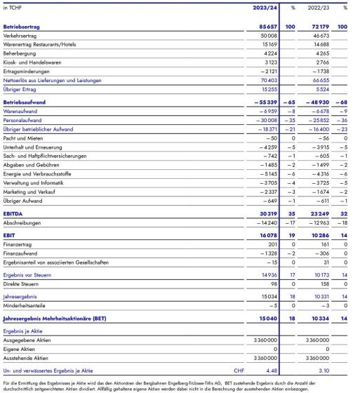 Der Verkehrsertrag der BET erhöhte sich von CHF 46.7 Mio. im Vorjahr auf CHF 50 Mio., der Betriebsertrag stieg von CHF 72.2 Mio. auf CHF 85.7 Mio. Der Betriebsaufwand nahm von CHF 48.9 Mio. auf CHF 55.3 Mio. zu, hauptsächlich begründet durch den Anstieg des Personalaufwands von CHF 25.9 Mio. auf CHF 30 Mio. Für das Projekt Titlis musste das Logistik-Team aufgestockt werden, dazu wurden die Geschäftsleitung sowie diverse Abteilungen verstärkt. Über das ganze Geschäftsjahr 2023/24 wurde ein EBITDA (Betriebsergebnis vor Zinsen, Steuern, Abschreibungen und Amortisationen) von CHF 30.3 Mio. erwirtschaftet (Vorjahr CHF 23.2 Mio.). Der Reingewinn stieg – nicht zuletzt dank einem Grundstückverkauf – von CHF 10.3 Mio. auf CHF 15 Mio. Der Verwaltungsrat beantragt der Generalversammlung, eine Dividende von CHF 0.80 pro Aktie auszuschütten.