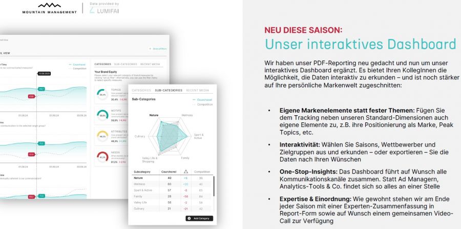 Next Level – Markenkommunikation für Ski-DestinationenWollen Sie Ihre Markenstrategie täglich spürbar machen — ohne Ihre Teams zu überlasten? Möchten Sie Wettbewerbs-Trends und die attraktivsten Inhalte für Ihre Zielgruppen erkennen, noch bevor teure Kampagnen live gehen? Seit der Wintersaison 23/24 erfassen Lumifai und Mountain-Management in enger Zusammenarbeit kontinuierlich die Online-Werbung und Social-Media-Feeds in den Top-Skiregionen des Alpenraums — und zwar sowohl im Winter als auch im Sommer. Auf Basis einer KI-gestützten Analyse werden dominierende Themen, relevante Content-Formate und Reisenden-Verhalten automatisch identifiziert. Das Ergebnis: ein digitales Monitoring, das Kommunikationsverantwortlichen erlaubt, strategische Markenarbeit in die tägliche operative Kommunikation zu übersetzen — schnell, treffsicher und ohne stundenlangen manuellen Aufwand. Bekannte Skiregionen wie: Serfaus-Fiss-Ladis, Kitzbühel, St. Moritz, Obertauern, Andermatt, Madonna di Campiglio, Grindelwald, Schilthorn,… arbeiten bereits mit diesen wertvollen Informationen. Die Intelligence hinter dem System erkennt in Echtzeit, welche Botschaften sichtbar wirken, welche Bildwelten bei welchen Zielgruppen Anklang finden und wo sich Differenzierungspotenzial gegenüber Mitbewerbern ergibt. So können Marketingteams Content-Tests, Paid- und Organic-Strategien sowie Zielgruppenansprache datenbasiert planen — und Kampagnen erst dann groß skalieren, wenn die Erfolgswahrscheinlichkeit empirisch gestützt ist. Neu und besonders wirkungsvoll: das interaktive Dashboard. Ergänzend zum herkömmlichen PDF-Reporting ermöglicht das Dashboard eine explorative, persönliche Datenansicht, die sich an der Markenwelt der Nutzer orientiert. Anwender können Filter setzen, Trends filtern, Storys für Management-Meetings zusammenstellen und Paid- versus Organic-Performance ganzheitlich bewerten. Die automatische Datenerhebung und vorkonfigurierten High-Level-Reports sparen Zeit und schaffen Raum für strategische Entscheidungen statt für Reporting-Routine. Das Angebot richtet sich an Marketing- und Kommunikationsverantwortliche von Ski-Destinationen und Tourismus-Marketing-Teams, die ihre Markenstrategie mit weniger Ressourceneinsatz täglich leben, schneller auf Wettbewerbsentwicklungen reagieren und ihre Werbeinvestitionen zielgerichteter einsetzen möchten. Für Interessierte steht ein kostenloser Testzugang zur Verfügung. Weiterführende Informationen finden Sie auf www.mountain-m.com unter Produkte → Marken-Image Tracking. Für die Einrichtung eines Testzugangs oder individuelle Fragen wenden Sie sich bitte an: Lumifai GmbH — Herr Marius Streb |