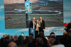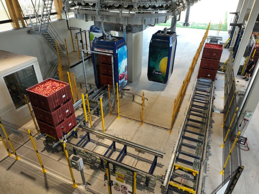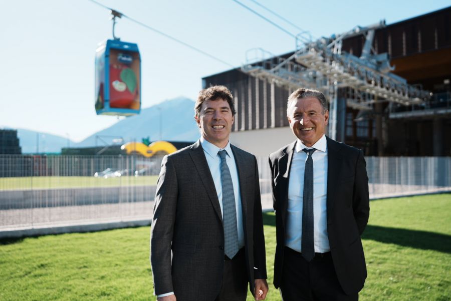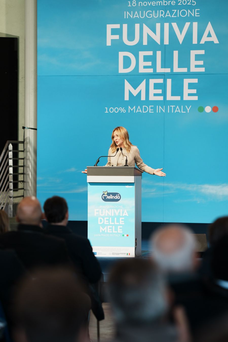 LEITNER: Startschuss für die weltweit erste „Apfelseilbahn“LEITNER und Melinda realisieren historisches Projekt in Norditalien und vermeiden damit 5.000 LKW Fahrten auf der Straße Am 18. November wurde in der italienischen Provinz Trient ein Meilenstein für nachhaltige Logistik gesetzt: Die weltweit erste Seilbahn für den Apfeltransport nahm offiziell ihren Betrieb auf. Die feierliche Eröffnung fand unter großer medialer Aufmerksamkeit und mit hochrangigen Gästen statt – darunter Italiens Ministerpräsidentin Giorgia Meloni, Landwirtschaftsminister Francesco Lollobrigida sowie die Führungsspitze von Melinda (Präsident Ernesto Seppi) und LEITNER, vertreten durch Anton Seeber und Martin Leitner. In Predaia im Nonstal hat sich das Konsortium Melinda, das jährlich 400.000 Tonnen Äpfel produziert, für LEITNER entschieden, um die weltweit erste Seilbahnanlage für den Fruchttransport zu realisieren. Technisch handelt es sich um eine kuppelbare Einseilumlaufbahn mit 11 Stützen (davon sechs in einem Tunnel), einer Länge von 1.300 Metern und einem Höhenunterschied von 87 Metern. Die Anlage kann stündlich 460 stapelbare Lagerkisten zu je 300 Kilogramm mit einer Geschwindigkeit von fünf Metern pro Sekunde transportieren. Die Strecke beginnt in der Verarbeitungsanlage in Predaia und führt zu einem Drittel durch das Innere eines Stollens, welcher für den Abbau von Dolomitgestein errichtet wurde, um die unterirdischen Kühlzellen zu erreichen: Ein „natürlicher Kühlschrank“ mit kontrollierter Temperatur im Herzen der Dolomiten, der heute schon 30 % Strom gegenüber einem herkömmlichen Lager einspart und den Bau neuer Gebäude an der Oberfläche überflüssig macht. Dank der Installation von elektrischen Rolltoren an den Kabinen, die sich beim Erreichen der Station automatisch öffnen und schließen, sind die Be- und Entladevorgänge vollständig automatisiert und benötigen keine manuelle Unterstützung. Insgesamt benötigt das System nur einen Mitarbeiter, der für die Überwachung des reibungslosen Betriebs und die Kontrolle der Anlage zuständig ist. In der Endstation der Seilbahn ist zudem ein 26 Meter hoher Lastenaufzug mit einer Tonne Tragfähigkeit integriert, der die beiden Lagerebenen verbindet und ebenfalls über ein vollständig automatisiertes Be- und Entladesystem verfügt. Die „Apfelseilbahn“ – teilweise finanziert durch das europäische Programm „Next Generation EU“, das 40 % der Investitionen übernommen hat – wird so 5.000 LKW-Fahrten vermeiden und die CO2-Emissionen im Tal deutlich senken. Im Rahmen der feierlichen Eröffnung beschrieb Ministerpräsidentin Giorgia Meloni die weltweit erste Apfelseilbahn als wegweisendes Projekt für nachhaltigen Transport: „Wir stehen vor einer Anlage, die zu 100 % "made in Italy“ realisiert wurde, mit erneuerbarer Energie betrieben wird und in der Lage ist, Äpfel in einer einzigartigen Weise zu transportieren. Die unterirdischen Lagerräume, die in das Herz des Dolomitengesteins gegraben wurden und einen riesigen natürlichen Kühlraum bilden, ermöglichen es, Energiekosten zu senken, die Umwelt zu schonen und Bodenversiegelung zu vermeiden. Die unterirdischen Kühlzellen und die Apfelseilbahn sind ein beeindruckendes innovatives Produktions- und Organisationsmodell.“ |