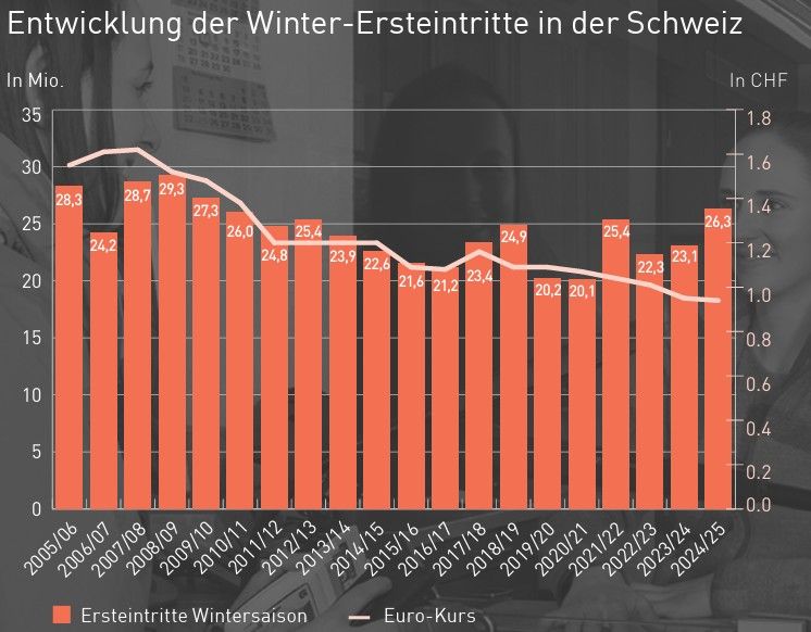 - Im Winter 2024/25 wurden 26,3 Millionen Ersteintritte in den Schweizer Skigebieten gezählt.