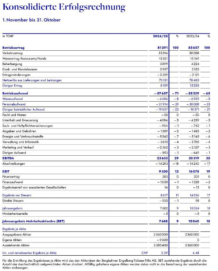 Titlis: Starkes Geschäftsjahr bei laufendem GenerationenprojektDie Bergbahnen Engelberg-Trübsee-Titlis AG (BET) blickt auf ein sehr erfolgreiches Geschäftsjahr 2024/25 zurück. Trotz geopolitischer Spannungen, wirtschaftlicher Unsicherheiten und der anspruchsvollen Bauphase auf dem Titlis, die das Gipfelerlebnis zeitweise spürbar beeinträchtigte, konnte das Unternehmen operativ weiter zulegen und die Besucherzahlen deutlich steigern. Die Zahl der Ersteintritte stieg um 4.3 Prozent auf 1’162’767 Gäste – das drittbeste Ergebnis in der Geschichte der BET. Allein zwischen November 2024 und April 2025 besuchten 651'599 Gäste den Titlis. Ein Plus von 7.3 Prozent gegenüber dem Vorjahr und ein neuer Halbjahresrekord für das Unternehmen. Auch der weitere Jahresverlauf entwickelte sich sehr positiv und unterstreicht die anhaltende Attraktivität des Titlis als ganzjähriges Ausflugsziel. Im Geschäftsjahr 2024/25 stieg die Anzahl Gruppenreisender um 2.6 Prozent, jene der Individualreisenden um 4.3 Prozent und jene der Schneesportgäste um 5.8 Prozent. Der Verkehrsertrag erhöhte sich von CHF 50 Mio. auf CHF 53.3 Mio. Der Betriebsertrag ging von CHF 85.7 Mio. auf CHF 81.3 Mio. zurück, weil das Vorjahresergebnis durch den einmaligen Verkauf des Grundstücks Steinacher in Höhe von CHF 8 Mio. positiv beeinflusst wurde. Der Betriebsaufwand erhöhte sich von CHF 55.3 Mio. auf CHF 57.7 Mio., insbesondere aufgrund des parallel laufenden Tages- und Baubetriebs sowie des damit verbundenen Personalbedarfs. Der Gewinn sank von CHF 15 Mio. auf CHF 7.7 Mio. und das EBITDA (Betriebsergebnis vor Zinsen, Steuern, Abschreibungen und Amortisationen) von CHF 30 Mio. auf CHF 23.6 Mio. Diese rückläufigen Kennzahlen lassen sich vollständig auf den einmaligen Sondereffekt aus dem Vorjahr – den Verkauf des Grundstücks Steinacher – zurückführen. Bereinigt um diesen Sondereffekt zeigt sich ein ausgesprochen erfreuliches Bild: Operativ erzielte die BET mit über 1.16 Mio. Gästen ein Topergebnis – trotz der äusserst anspruchsvollen Bautätigkeiten auf dem Gipfel und beim Berghotel Trübsee, wo im Hinblick auf den anstehenden Rückbau der Titlis Bergstation Provisorien und neue Gastronomie-Formate errichtet wurden. Dies stellte hohe Anforderungen an Betriebsabläufe, Mitarbeitende und Infrastruktur. Der Verwaltungsrat beantragt der Generalversammlung, eine unveränderte Dividende von CHF 0.80 pro Aktie auszuschütten. Trotz des Anstiegs des Fremdkapitals im Zuge des Projekts Titlis weist die BET eine sehr solide Bilanzstruktur mit einer Eigenkapitalquote von 62% aus. Ein wichtiger Meilenstein für das Engelberger Traditionsunternehmen war die Entfernung des Gerüsts am Titlis Tower im Herbst, der Ende Mai 2026 eröffnet wird. Die mediale Resonanz war sehr erfreulich und die Aussenwahrnehmung der Destination wurde spürbar gestärkt. Der Turm zeigt sich heute in seiner ganzen Eleganz und entfaltet bereits seine Strahlkraft. Die Basis für dieses Zukunftsprojekt wurde vor über zehn Jahren mit gezielten Investitionen wie dem Titlis Resort oder dem Titlis Xpress gelegt. Heute realisiert die BET das Herzstück dieser langfristigen Strategie. Parallel zu den baulichen Investitionen wurde auch die organisatorische, personelle und kulturelle Transformation des Unternehmens konsequent vorangetrieben. Diese weitsichtigen Weichenstellungen ermöglichen den BET ein nachhaltiges Wachstum, steigern ihre Ertragskraft und stärken gleichzeitig die touristische Wettbewerbsfähigkeit der Destination Engelberg-Titlis. Das sehr positive Ergebnis bestätigt die Attraktivität des bestehenden Angebots, während der Titlis Tower und die neue Bergstation weiteres Wachstumspotenzial eröffnen. |