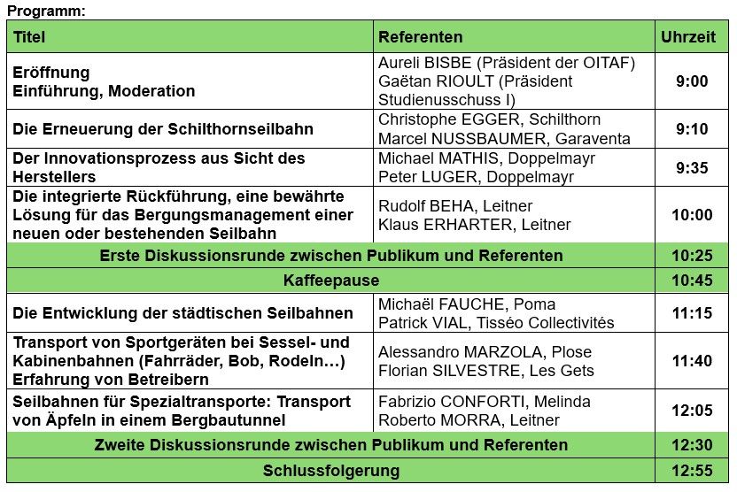 OITAF Seminar ALPEXPO – MOUNTAIN PLANETWie beeinflussen die Bedürfnisse der Betreiber die Planung von Seilbahnen? Die maßgeschneiderte Strategie für den nachhaltigen Erfolg. 22. April 2026, von 9:00 bis 13:00 Uhr Saal Chamrousse, Alp’expo, Grenoble Im Rahmen der internationalen Fachmesse MOUNTAIN PLANET 2026 organisiert die Internationale Organisation für das Seilbahnwesen (OITAF) traditionsgemäß ein Fachseminar, das vom Studienausschuss Nr. I (Allgemeine technische Bestimmungen) vorbereitet wurde. Das Thema soll die Vielfalt der Bedürfnisse und Anwendungsmöglichkeiten der Seilbahntechnologie hervorheben. Insbesondere soll gezeigt werden, wie es möglich ist, ausgehend von einer relativ standardisierten Technologie eine Anlage auszustatten oder zusätzliche Vorkehrungen zu treffen, um spezifischen und vielfältigen betrieblichen Anforderungen gerecht zu werden. Die Vorträge des Seminars, die von Fachleuten aus den Bereichen Planung, Bau und Betrieb von Seilbahnen aus verschiedenen Ländern gehalten werden, veranschaulichen diese Idee anhand konkreter Beispiele. Anhand dieser Auswahl von Anwendungen wird deutlich, wie Ideen weiterentwickelt, bereichert und im Austausch mit anderen konkretisiert werden. Das Seminar bietet den Teilnehmern ein spannendes Forum für den Austausch von Informationen, Wissen und Perspektiven. Vortragssprachen: Muttersprache der Referenten Einschreibung online unter https://oitaf.org/DEU/veranstaltungen/ Die Teilnahme ist kostenlos. |